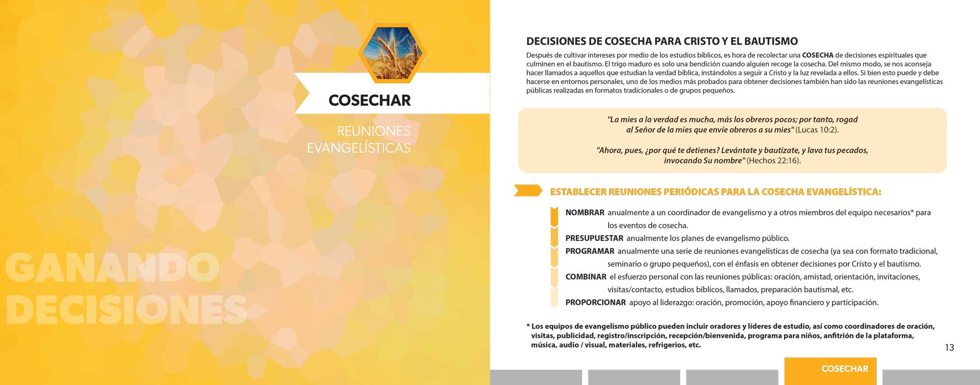 Después de cultivar intereses por medio de los estudios bíblicos, es hora de recolectar una COSECHA de decisiones espirituales que culminen en el bautismo. El trigo maduro es solo una bendición cuando alguien recoge la cosecha. Del mismo modo, se nos aconseja hacer llamados a aquellos que estudian la verdad bíblica, instándolos a seguir a Cristo y la luz revelada a ellos. Si bien esto puede y debe hacerse en entornos personales, uno de los medios más probados para obtener decisiones también han sido las reuniones evangelísticas públicas realizadas en formatos tradicionales o de grupos pequeños.