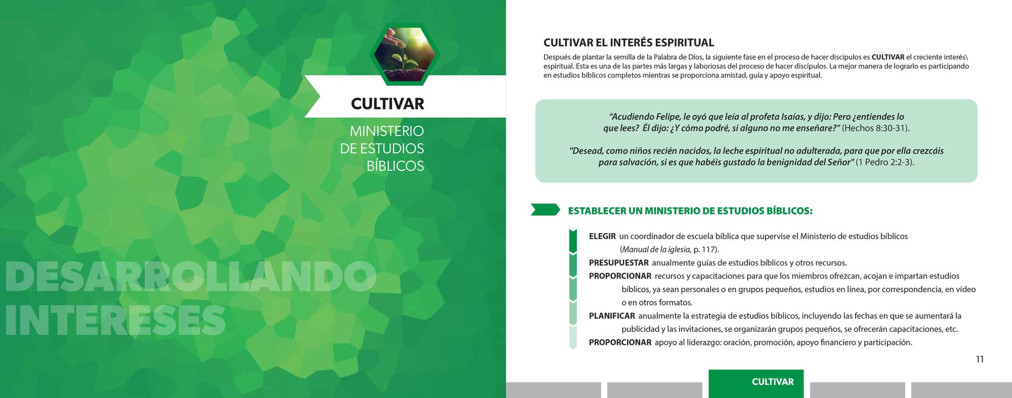 Después de plantar la semilla de la Palabra de Dios, la siguiente fase en el proceso de hacer discípulos es CULTIVAR el creciente interés\ espiritual. Esta es una de las partes más largas y laboriosas del proceso de hacer discípulos. La mejor manera de lograrlo es participando en estudios bíblicos completos mientras se proporciona amistad, guía y apoyo espiritual.